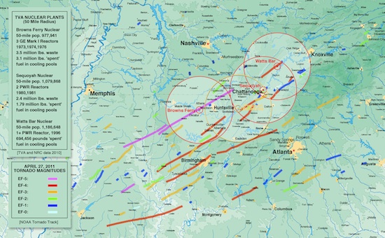 What if that EF-5 tornado had made a direct hit on a spent fuel cooling pool at Browns Ferry, ripping off the sheet metal roof and sucking cooling pool water into the tornado, then tossing that radioactive brew into our neighborhoods? What if all power had been lost or a cooling pool had been damaged, causing a leak and possible meltdown? What if flying objects from the tornado flew into a pool, damaging the radioactive fuel rods? Welcome to Fukushima in the Tennessee Valley.